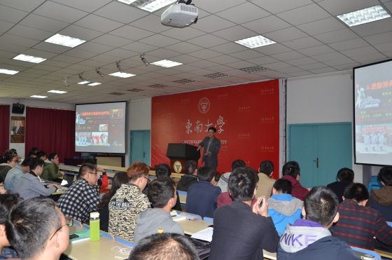 020145团支部讯:2016年4月7日下午,无锡市滨湖区河埒街道政协工委主任谢谦华应邀来校作了“中国载人航天工程发展现状与未来展望”的主题讲座,东南大学机械工程学院党委副书记王斌老师、大二年级辅导员刘宗涛老师以及各学院本硕博共200余名学生聆听了讲座。