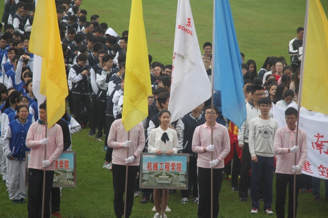 到八点,校运会开幕式正式开始。首先出场的是由经管女生组成的鲜花礼仪队护送的国旗护卫队,立刻吸引了观众的眼球,随后是机械工程学院男生组成的彩旗队,身着浅粉色上衣的汉子们扛着彩旗,气宇轩昂,展示了东大男生积极向上的精神面貌。由大一男生组成的方阵迈着整齐划一的步伐缓缓行进到主席台前,一声令下,方阵用绿丝带呈现出“ME”,令人眼前一亮。“百年辉煌,寰宇争锋,功勋伟业,唯我机械。”铿锵有力的十六个字,向全校展现了机械健儿奋勇拼搏的姿态。接着就是其他院系的入场了。在最后的领导致辞中,机械工程学院荣获十佳学院称号,希望在今年的校运会上再取佳绩。