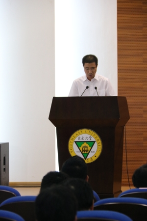 之后我院2015级本科生何宗杰同学作为学生代表上台发言。 他首先提到作为当代大学生应当具有社会担当与家国情怀,东大学子应充分利用现有的平台充分磨砺自己,同时也要发扬“钟山之崇高,玄武之恬静,大江之雄毅”的东大品格。他引用了张校长在开学典礼上的讲话:“每一个东大学子都努力在时代大潮中确立大志向,勇敢担当中华民族伟大复兴的历史使命,立志把自己淬炼成为具有家国情怀和国际视野,引领未来和造福人类的领军人才。”