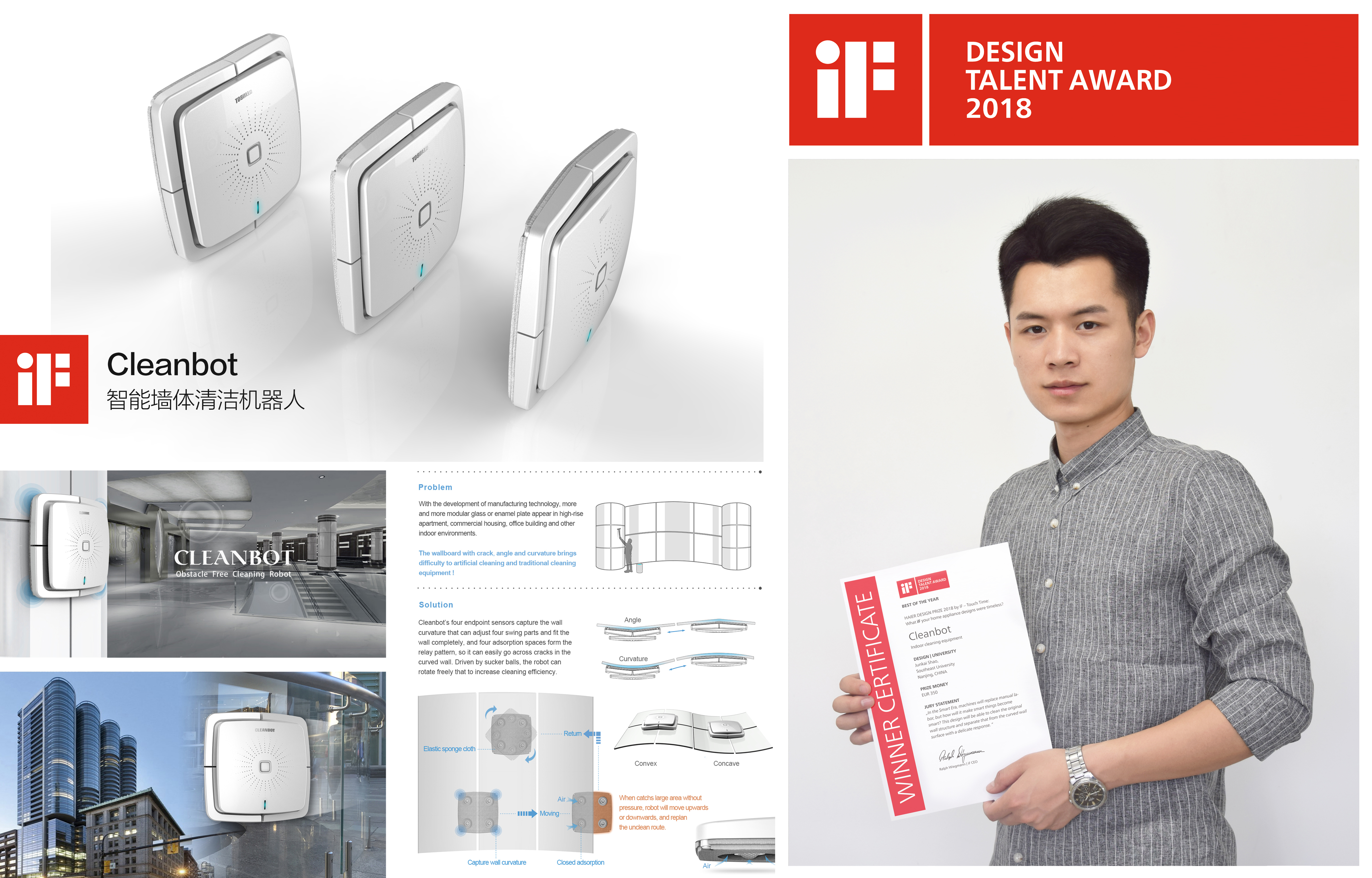近日,全球设计界备受瞩目的iF DESIGN TALENT AWARD 2018设计大奖揭晓,由leyu乐鱼web登录入口17级博士生邵俊凯设计、薛澄岐教授指导的作品“Cleanbot”,从全球50多个参赛国家,五千多件参赛作品中脱颖而出,历经60多位国际专家三轮评审,最终斩获“2018 iF设计新秀奖”。iF设计奖是设计界影响力最广、认知度最高的奖项,拥有设计界“奥斯卡奖”之美誉。