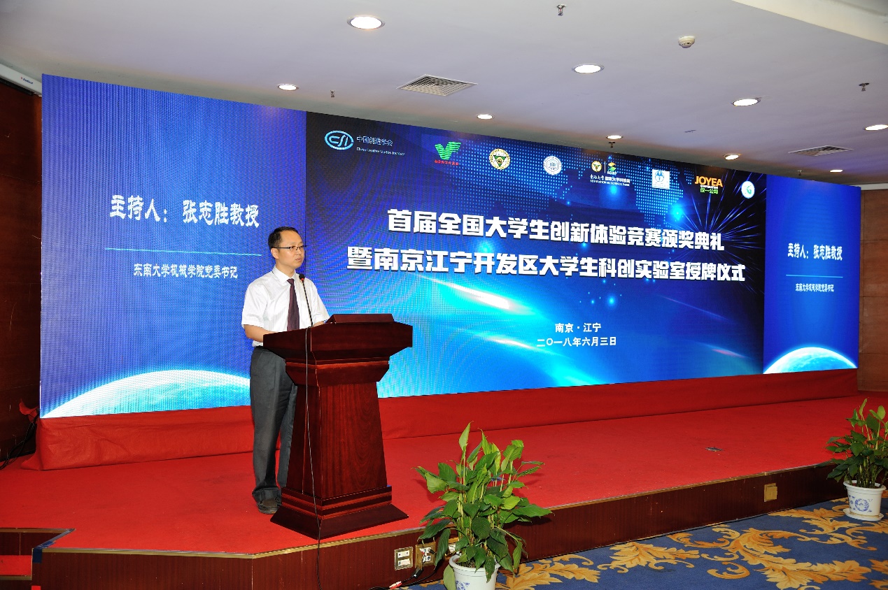 随后,6 月 3 日下午首届全国大学生创新体验竞赛颁奖典礼暨南京江宁开发区大学生科创实验室授牌仪式在东南大学九龙湖校区隆重举行,南京市领导、江宁区领导、东南大学领导出席活动并讲话。江宁开发区管委会、东南大学相关部处及院系、中国创造学会及相关单位的工作人员等近 300 人参加了活动。本次活动分为首届全国大学生创新体验竞赛颁奖及南京江宁开发区大学生科创实验室授牌两个环节,分别由leyu乐鱼web登录入口党委书记张志胜和南京江宁开发区科技人才局局长张洋主持。东南大学副校长吴刚教授,南京市科委副主任陈为生,中国创造学会常务副理事长兼秘书长张亚雷教授等嘉宾出席了本次活动。