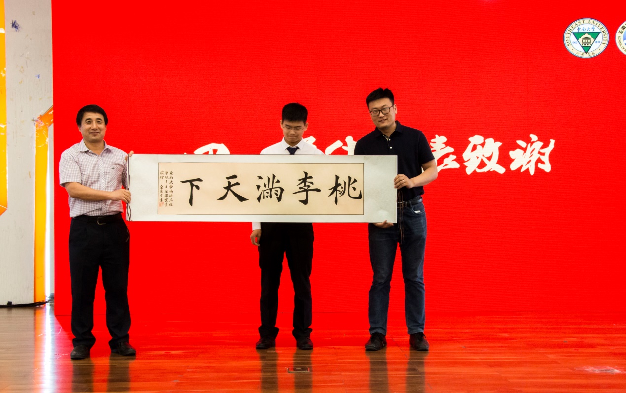 领取学院颁发的专属毕业生荣誉戒指之后,为表达同学们对四年来学院老师和辅导员的感恩,2018届毕业生余康宁同学作为毕业生代表,以一副亲手书写的书法字画作为礼物回馈学院;学院副院长陈云飞老师和青年教师代表耿可可老师一起接受了这份礼物。