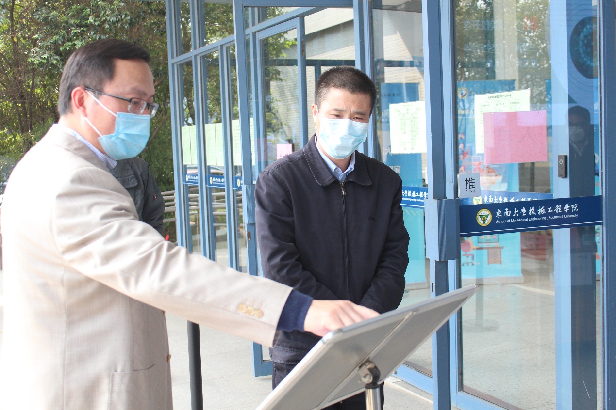 2020年4月20日下午,东南大学张广军校长在校办、设备处主要负责同志及相关人员陪同下到机械工程学院检查疫情防控工作。