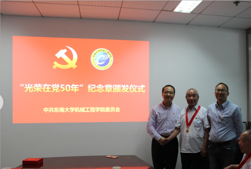 在庆祝中国共产党成立100周年之际,党中央决定颁发“光荣在党50年”纪念章。6月21日上午,机械工程学院在四牌楼校区电光源中心举行简朴隆重的仪式,向学院“光荣在党50年”老党员代表颁发纪念章。机械工程学院党委书记张志胜,机械工程学院院长倪中华,代表学院党委向荣获纪念章的老党员颁发纪念章。机械工程学院副院长陈震、电光源中心党支部书记张建忠参加了仪式。