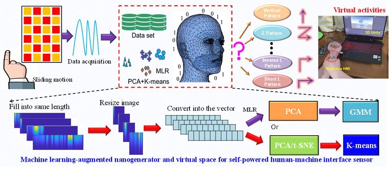柔性可穿戴人机交互的运动检测是物联网和虚拟现实的有意义的研究领域。传统人机交互界面输出信号曲线意义单一,本研究通过机器学习增强实现高性能的人机界面传感,可广泛应用于态势感知、数控机床虚拟现实、以及游戏体验应用。研究发现机器学习的PCA+K-means提供更明显的聚类和更好的可视化,使人机界面器件干扰强、柔性可穿戴、兼容人体环境,其无需外部电源、快速制造、高效率、廉价成本、实时监控优点,该器件为自供电人机交互传感和虚拟现实活动中的潜在应用开辟新的可能性。