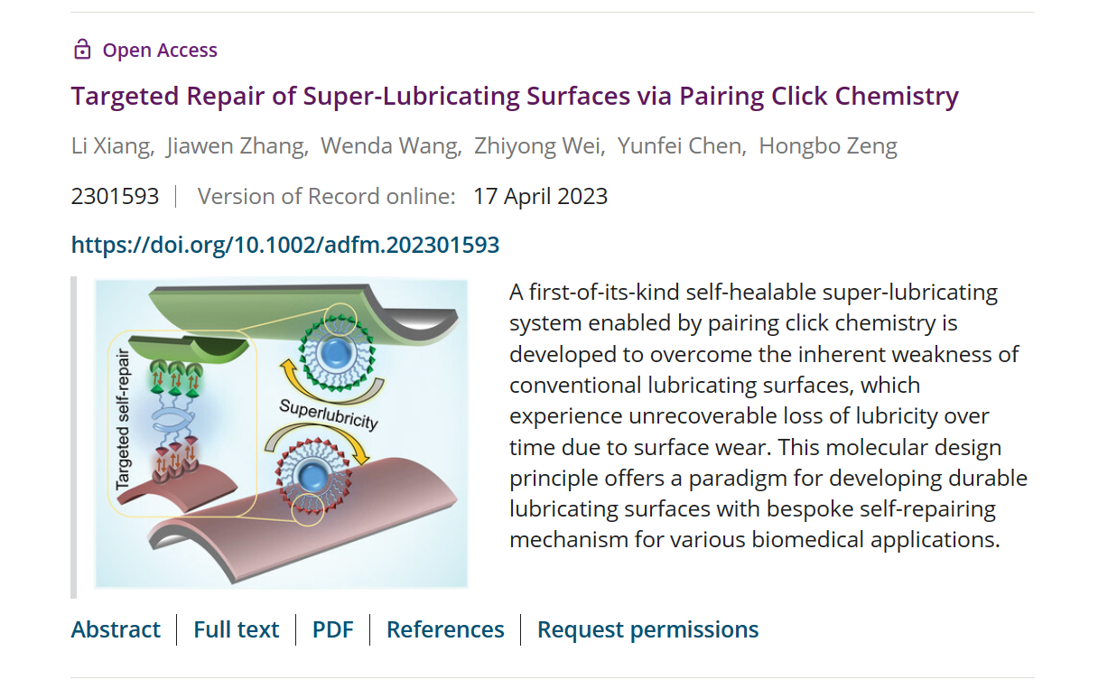 相关工作以“Targeted repair of super-lubricating surfaces via pairing click chemistry”为题,发表在材料学科国际顶级期刊Advanced Functional Materials上。项力副研究员为本文的第一作者,东南大学为第一作者单位和第一通讯单位。该研究工作受到了国家自然科学基金委以及江苏省基础研究计划自然科学基金等项目的资助。