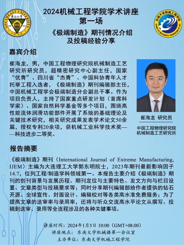 2024“百年机械、智造未来”大师论坛第一场:崔海龙研究员——《极端制造》期刊情况介绍及投稿经验分享