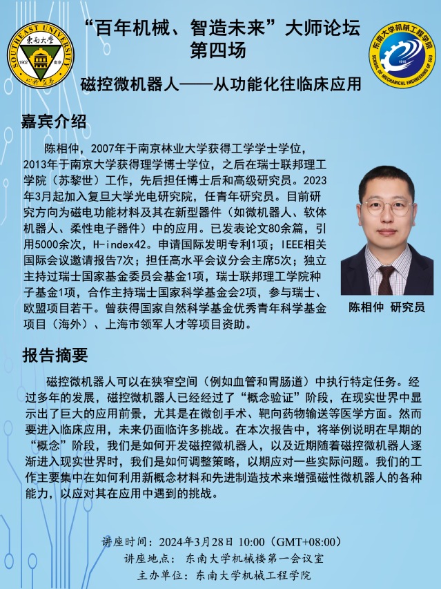 2024“百年机械、智造未来”大师论坛第四场:陈相仲研究员—— 磁控微机器人:从功能化往临床应用