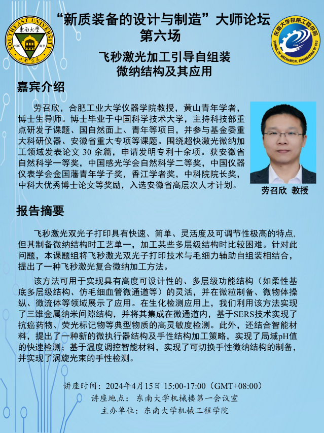 劳召欣, 合肥工业大学仪器学院教授, 黄山青年学者,博士生导师。 博士毕业于中国科学技术大学, 主持科技部重点研发子课题、 国自然面上、 青年等项目, 并参与基金委重大科研仪器、 安徽省重大专项等课题。 围绕超快激光微纳加工领域发表论文 30 余篇, 申请发明专利十余项。 获安徽省自然科学一等奖, 中国感光学会自然科学二等奖, 中国仪器仪表学会金国藩青年学子奖, 香江学者奖, 中科院院长奖,中科大优秀博士论文等奖励, 入选安徽省高层次人才计划。