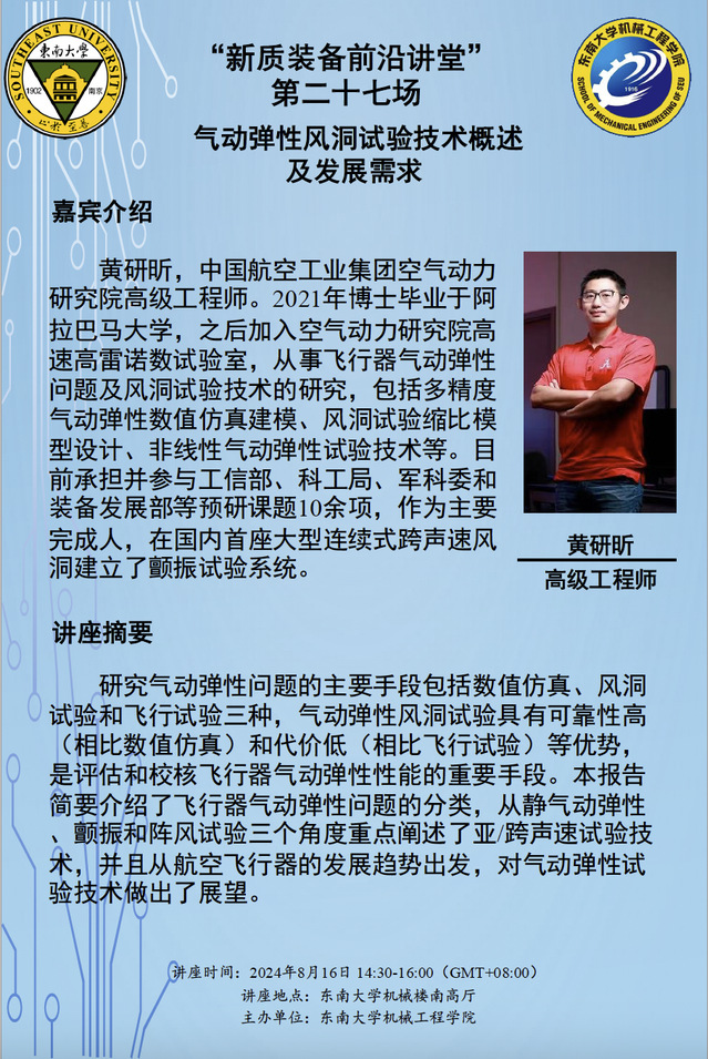 黄研昕,中国航空工业集团空气动力研究院高级工程师。2021年博士毕业于阿拉巴马大学,之后加入空气动力研究院高速高雷诺数试验室,从事飞行器气动弹性问题及风洞试验技术的研究,包括多精度气动弹性数值仿真建模、风洞试验缩比模型设计、非线性气动弹性试验技术等。目前承担并参与工信部、科工局、军科委和装备发展部等预研课题10余项,作为主要完成人,在国内首座大型连续式跨声速风洞建立了颤振试验系统。