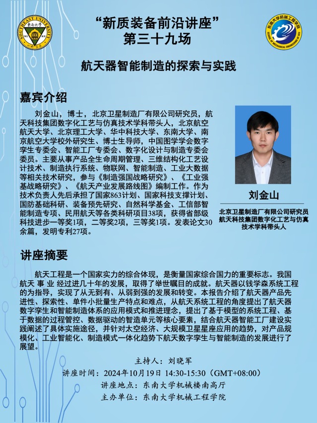 刘金山,博士,北京卫星制造厂有限公司研究员,航天科技集团数字化工艺与仿真技术学科带头人,北京航空航天大学、北京理工大学、华中科技大学、东南大学、南京航空大学校外研究生、博士生导师,中国图学学会数字孪生专委会、智能工厂专委会、数字化设计与制造专委会委员。主要从事产品全生命周期管理、三维结构化工艺设计技术、制造执行系统、物联网、智能制造、工业大数据等相关技术研究,参与《制造强国战略研究》、《工业强基战略研究》、《航天产业发展路线图》编制工作。作为技术负责人先后承担了国家863计划、国家科技支撑计划、国防基础科研、装备预先研究、自然科学基金、工信部智能制造专项、民用航天等各类科研项目38项,获得省部级科技进步一等奖1项,二等奖2项,三等奖1项。发表论文30余篇,发明专利27项。