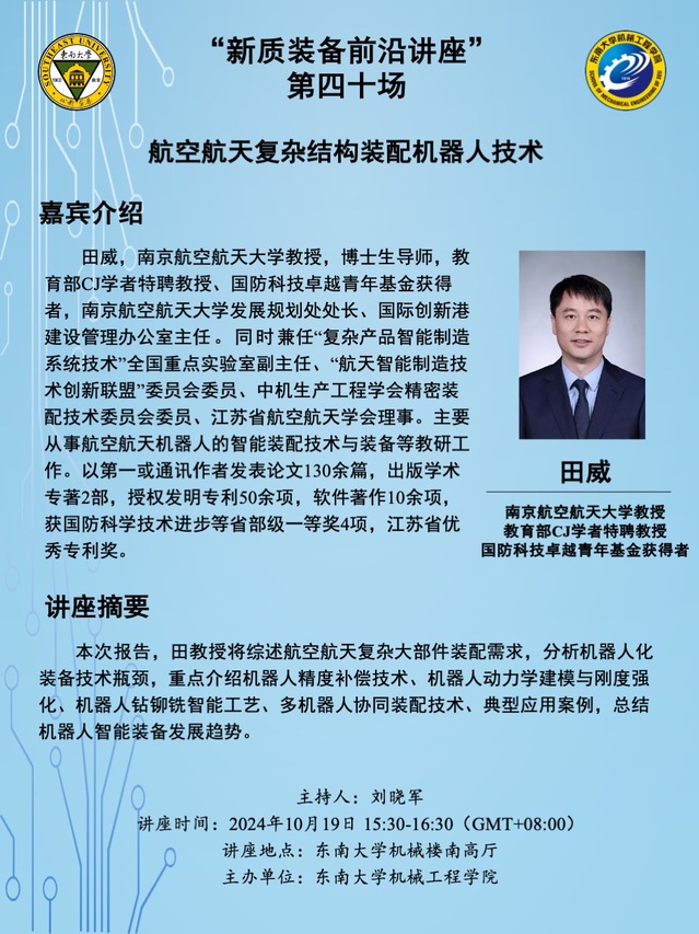 本次报告,田教授将综述航空航天复杂大部件装配需求,分析机器人化装备技术瓶颈,重点介绍机器人精度补偿技术、机器人动力学建模与刚度强化、机器人钻铆铣智能工艺、多机器人协同装配技术、典型应用案例,总结机器人智能装备发展趋势。