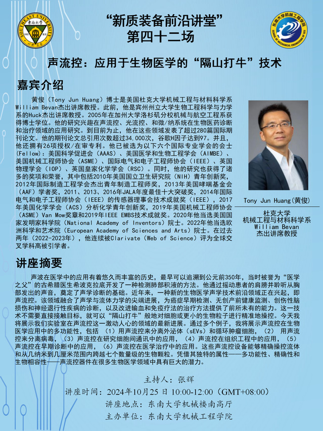 声波在医学中的应用有着悠久而丰富的历史,最早可以追溯到公元前350年,当时被誉为“医学之父”的古希腊医生希波克拉底开发了一种检测肺部积液的方法。他通过摇动患者的肩膀并聆听从胸部发出的声音,奠定了声学诊断的基础。近年来,一种新的生物医学声学技术前沿领域正在兴起,即声流控。该领域融合了声学与流体力学的尖端进展,为癌症早期检测、无创产前健康监测、创伤性脑损伤和神经退行性疾病的诊断,以及改进输血和免疫疗法的治疗方法提供了前所未有的能力。这一技术不需要直接接触目标,就可以“隔山打牛”般地对细胞或更小的生物粒子进行精准地操控。今天我将展示我们实验室在声流控这一激动人心的领域的最新进展。通过多个例子,我将展示声流控在生物医学应用中的多功能性,包括 (1)用声流控来分离外泌体(sEVs)和循环肿瘤细胞,(2) 用声流控来分离病毒,(3)声流控在研究细胞间通讯中的应用,(4)声流控在组织工程中的应用,(5)声流控在早期诊断中的应用,(6)声流控在医学治疗中的应用。这些声流控设备能够精确操控流体和从几纳米到几厘米范围内跨越七个数量级的生物颗粒。凭借其独特的属性——多功能性、精确性和生物相容性——声流控器件在很多生物医学领域中具有巨大的潜力。