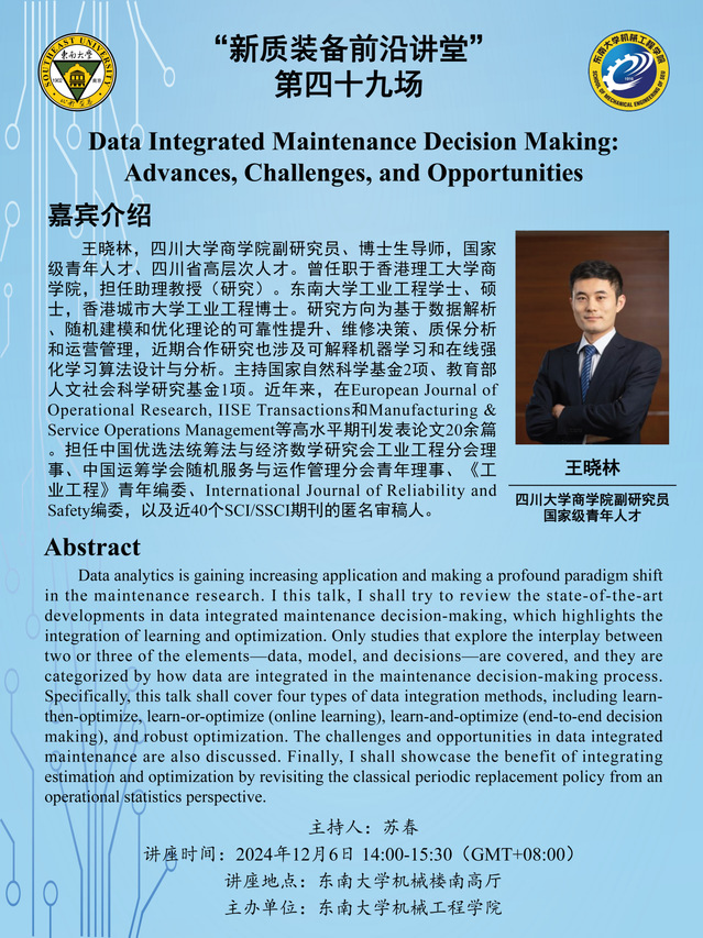 王晓林,四川大学商学院副研究员、博士生导师,国家级青年人才、四川省高层次人才。曾任职于香港理工大学商学院,担任助理教授(研究)。东南大学工业工程学士、硕士,香港城市大学工业工程博士。研究方向为基于数据解析、随机建模和优化理论的可靠性提升、维修决策、质保分析和运营管理,近期合作研究也涉及可解释机器学习和在线强化学习算法设计与分析。主持国家自然科学基金2项、教育部人文社会科学研究基金1项。近年来,在European Journal of Operational Research, IISE Transactions和Manufacturing & Service Operations Management等高水平期刊发表论文20余篇。担任中国优选法统筹法与经济数学研究会工业工程分会理事、中国运筹学会随机服务与运作管理分会青年理事、《工业工程》青年编委、International Journal of Reliability and Safety编委,以及近40个SCI/SSCI期刊的匿名审稿人。