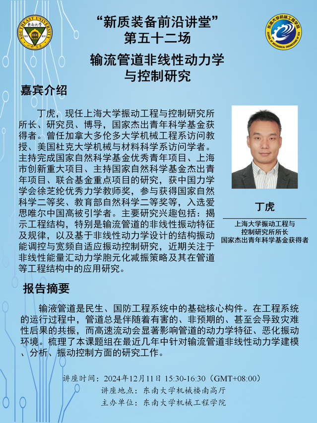 丁虎,现任上海大学振动工程与控制研究所所长、研究员、博导,国家杰出青年科学基金获得者。曾任加拿大多伦多大学机械工程系访问教授、美国杜克大学机械与材料科学系访问学者。主持完成国家自然科学基金优秀青年项目、上海市创新重大项目、主持国家自然科学基金杰出青年项目、联合基金重点项目的研究,获中国力学学会徐芝纶优秀力学教师奖,参与获得国家自然科学二等奖、教育部自然科学二等奖等,入选爱思唯尔中国高被引学者。主要研究兴趣包括:揭示工程结构,特别是输流管道的非线性振动特征及规律,以及基于非线性动力学设计的结构振动能调控与宽频自适应振动控制研究,近期关注于非线性能量汇动力学胞元化减振策略及其在管道等工程结构中的应用研究。
