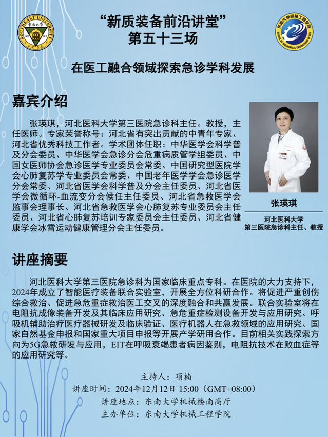 2024年12月12日,由leyu乐鱼web登录入口主办的“新质装备前沿讲堂”第五十三场在东南大学机械楼南高厅成功举办。本次活动特别邀请了河北医科大学第三医院急诊科主任张瑛琪教授作为主讲嘉宾,开展了关于“在医工融合领域急诊学科发展”的学术报告。报告会由项楠老师主持,河北医科大学第三医院急诊科副主任李梅、南京航空航天大学姚佳烽老师、朱桂平老师、刘凯老师共同出席了本次活动。