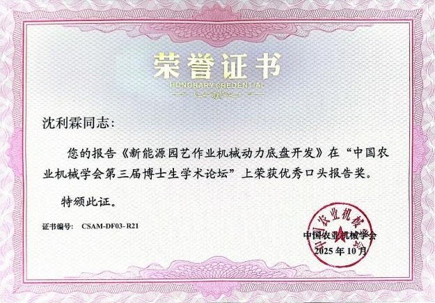 2025年10月18日,中国农业机械学会第三届博士生学术论坛在合肥召开。我院殷国栋教授团队2024级博士研究生沈利霖、白鑫依托国家重点研发计划“工厂化农业关键技术和智能农机装备”重点专项 “新能源园艺作业动力机械创制开发”,分别围绕轮式、履带式新能源农机装备动力底盘设计进行了工作进展汇报,双双荣获得论坛“优秀口头报告”奖。