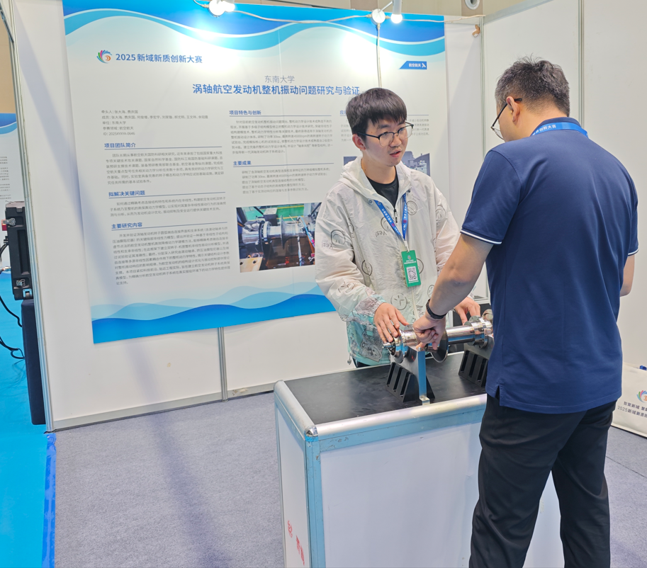 工业和信息化部主办的2025新域新质创新大赛决赛在青岛圆满收官。在学校研究生院和学院的指导下,学院何俊增、李宏宇、刘家璇、郝尤明、王文祥、余冠霆(指导教师:费庆国、张大海)组成的赛队“涡轴航空发动机整机振动问题研究与验证”项目,作为东南大学唯一进入全国总决赛的项目,历经全国预选赛、初赛和决赛的激烈角逐,最终获得优胜奖,充分展现了机械学院师生勇于挑战、创新不止的风采。