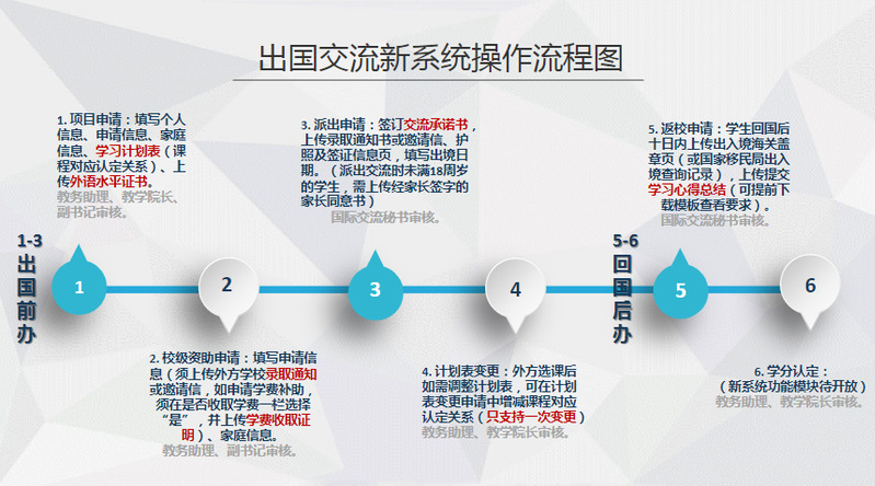自2018级起出国交流本科生须在出国前于本系统填报出国交流项目申请、校级资助申请、派出申请(含上传签证信息、出国承诺书);在国外选课期间可进行一次学习计划表变更;回国后于系统填报返校申请(含上传出入境信息、交流心得总结)以及学分认定申请。在线填报所有信息须及时、完备。学院管理教师须在线进行相应审核,同时可在本系统进行院级项目维护、出国学生信息查询及下载等。具体参见以下流程图及操作手册。