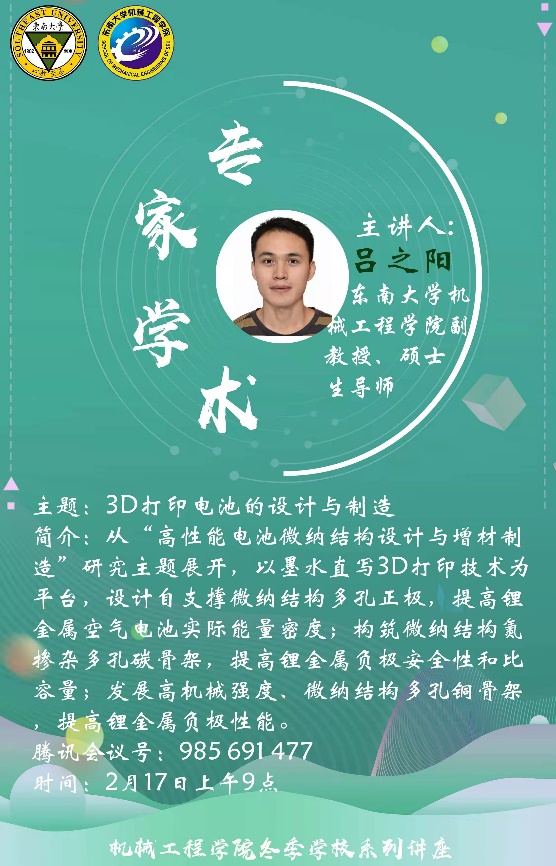 2月17日,leyu乐鱼web登录入口副教授吕之阳老师为同学们开展了一场关于3D打印技术的讲座。围绕着3D打印电池的设计与制造这一话题,吕之阳副教授通俗详尽地介绍了增材制造的技术定义,技术特点以及应用领域,并从未来可穿戴设备的发展及智能设备小型化的趋势,对体积更小、容量更大的电池的需求,结合3D打印电池的优越特点,高瞻远瞩地提出了3D打印在电池制造方面研究的必要性。最后,吕之阳副教授展示了自己在电池微纳结构的设计与3D打印构筑的具体成果,并对3D打印电池这一领域做出了积极的展望。