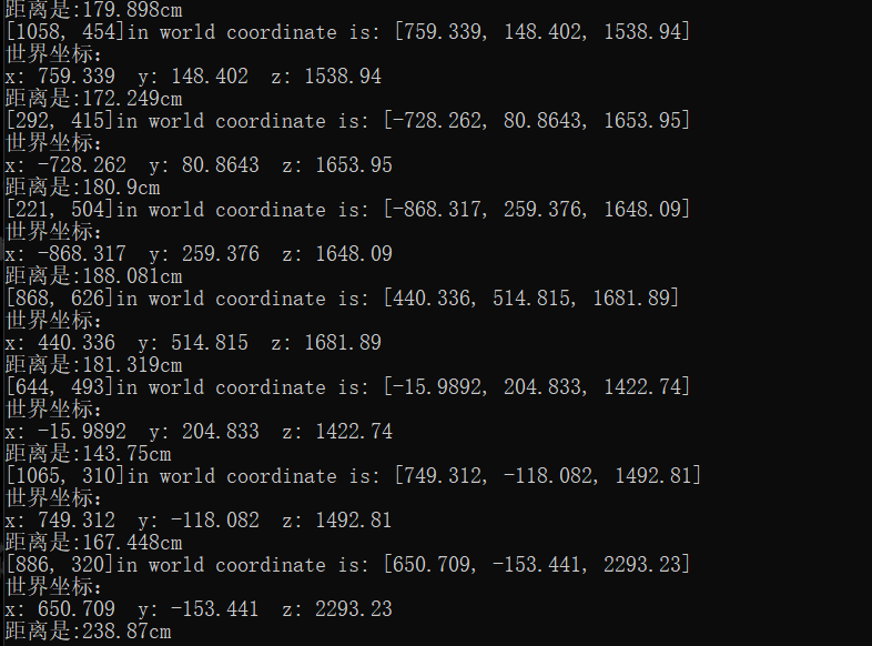 4.距离测定。通过拖动视差图上方三个滑动条可以调节blockSize(SAD窗口大小),numDisparities(视差窗口)和uniquenessRatio(唯一性比率)三个参数的大小,以此来获得噪点较少的视差图,使深度信息更加精准。最终实现了高精度的双目测距。