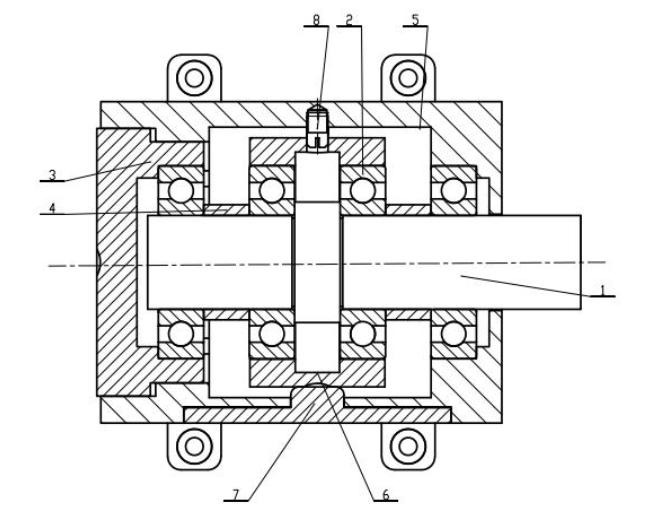 装配图结构由机架、主轴、 轴套、 轴向加载端盖、 径向加载端盖、 径向加载块共 6 个零件和 4 个 6207 轴承组成。
