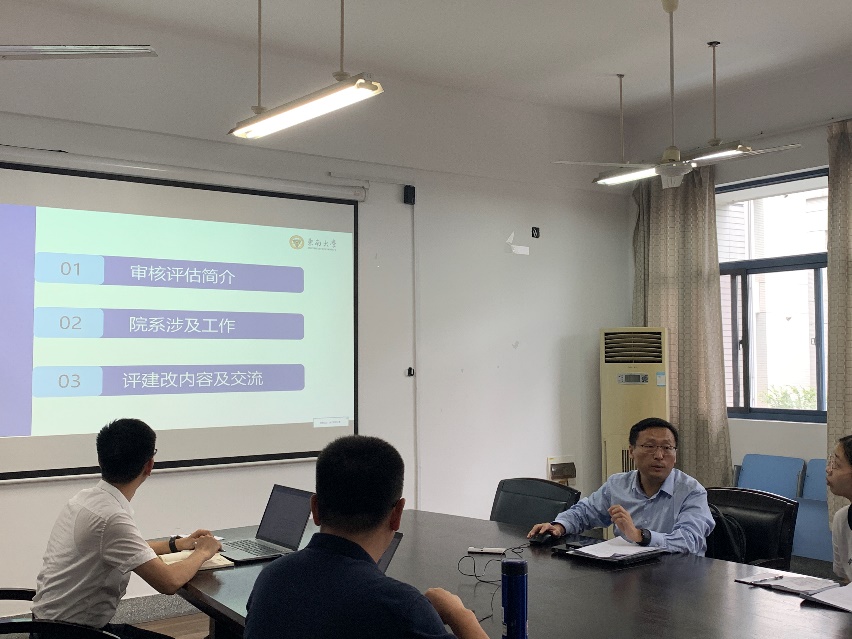 张健副处长首先对审核评估工作概况进行了简要介绍,详细分析和解读了院系涉及的各项工作重点、审核评估关键时间节点、以及具体材料准备的注意事项等,希望学院能够以专业认证工作为基础,成立院系迎评专班,研讨制定考察接待工作方案,为审核评估做好充分准备。