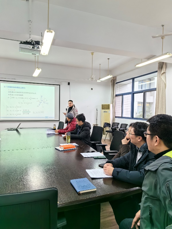 试讲人从流体静力学的应用于研究背景出发,阐述了作用在流体上的力及其特点,并推导了流体平衡微分方程及压差方程。试讲完成后,各位老师针对试讲人分别进行了点评并提出宝贵意见,以便试讲人在后续的课程教学中有针对性地加以改进,不断提升教学质量。